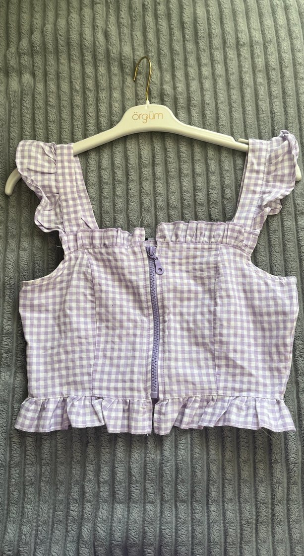 ön fermuarlı, fırfırlı detaylı, pastel mor kareli bluz. trendyoldan aldim xs beden hicbir kusuru yok