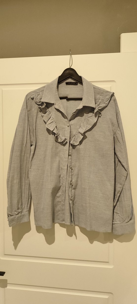Gri keten kumaştan, yakalı ve fırfır detaylı, uzun kollu bol kesim gömlek. Günlük kullanım için normal boyda. Milla 38 beden gomlek