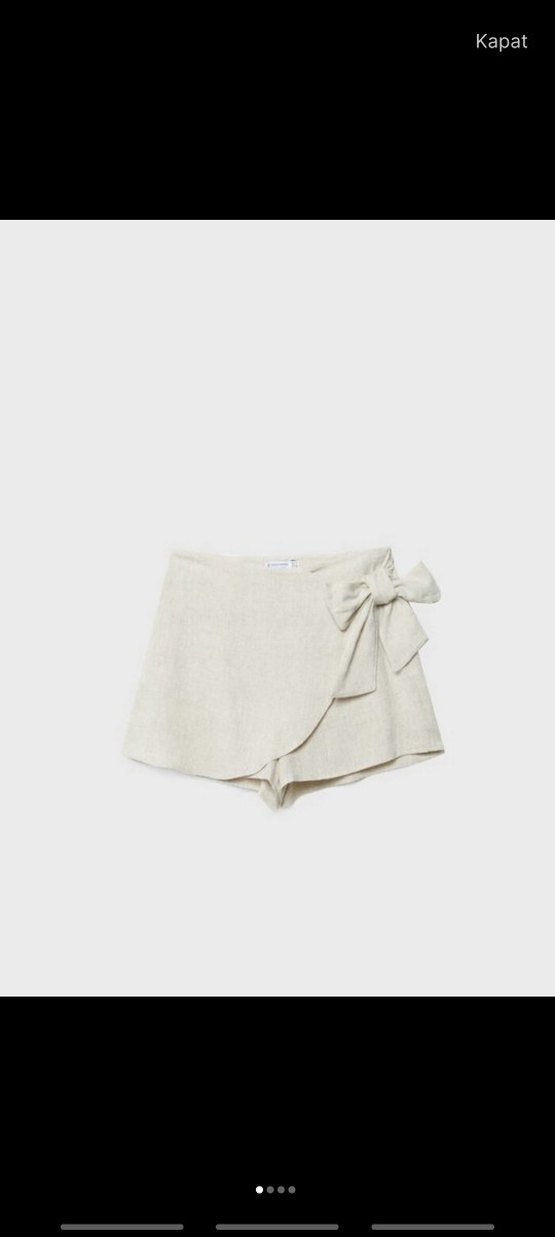 Fırfırlı detayı ve keten kumaşıyla bej renkte, bol kesim kısa hamile şortu. Minimalist tarzda, günlük kullanım için uygun.