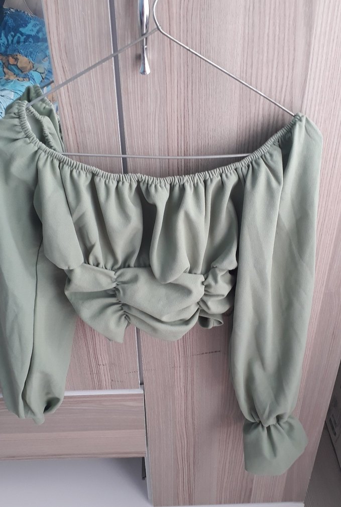 Keten kumaştan, fırfırlı ve kayık yakalı bol kesim mini bluz. Uzun, büzgülü kolları ve kısa boyu ile rahat sokak stiline uygun.