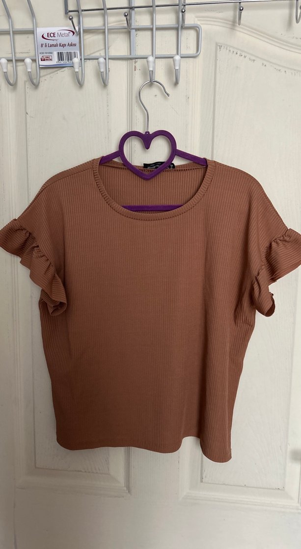 Kahverengi, yuvarlak yakalı, kısa kollu ve fırfırlı detaylı, bol kesim kadın tişörtü. Yumuşak sentetik kumaştan, günlük rahat stil için uygundur.