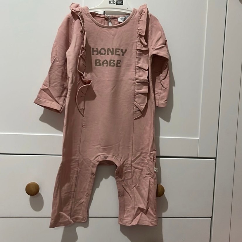 Ön kısmında fırfır detayları ve "HONEY BABE" baskısı bulunan kız bebek tulumu. Uzun kollu ve alt kısmında çıtçıtlıdır. Tertemiz deformesiz. E bebekten alındı. 12-18 ay