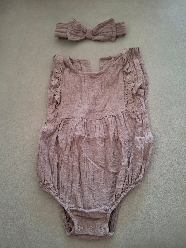 sadece fotoğraf çekiminde kullanıldı. Yumuşak dokulu kumaştan yapılmış, fırfır detaylı bej kız bebek tulumu ve uyumlu saç bandı. Kolay giydirme için çıtçıtlı kapanış.