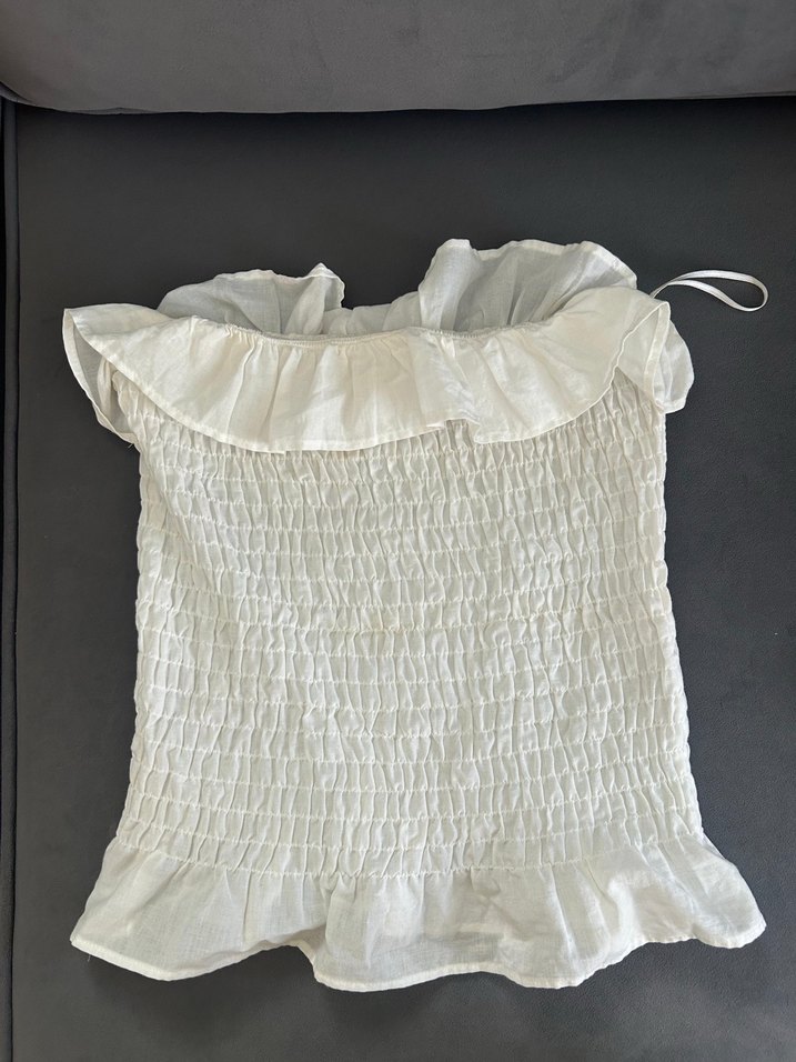 Yumuşak keten kumaştan, fırfırlı yakalı ve bol kesimli kolsuz beyaz bluz, bohem tarzda rahat bir görünüm sunar.