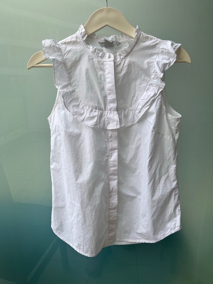 Keten kumaştan, yakalı ve fırfırlı detaylara sahip kolsuz beyaz gömlek. Salaş kesimiyle bohem tarz sunar, günlük kullanıma uygundur.