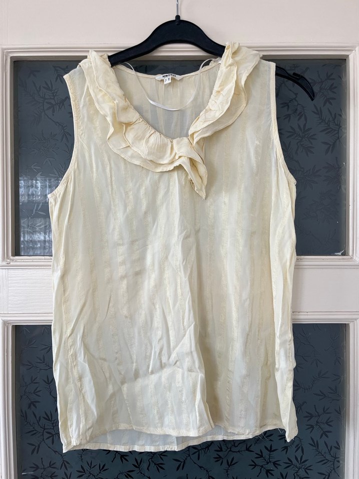 Kolsuz, keten bluz, yakasında fırfır detayları bulunur. Salaş kesim ve midi boydadır.