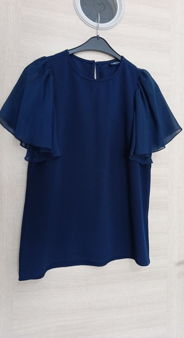 Lacivert renkte, kısa fırfırlı kollu, yuvarlak yakalı, rahat kesim kadın bluz.