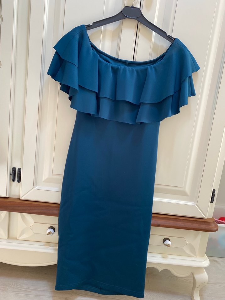 Fitted kesim, uzun lacivert abiye elbise, straplez yakası ve katlı fırfır detayıyla modern klasik ve Paris tarzını yansıtıyor. Kolsuz tasarımı şıklık katıyor.