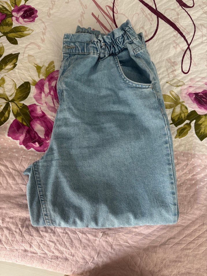 Salaş kesim, bel kısmında fırfırlı detaylı mavi denim pantolon. Günlük kullanım için normal midi boyda, rahat sokak stili.