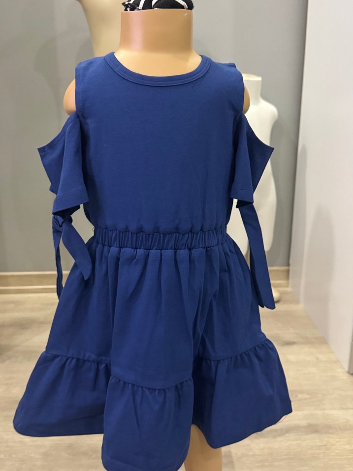 Mavi renkli kız çocuk elbisesi, fırfır detaylı ve bol kesimdir. Askılı, straplez yakaya sahip olan elbise, yumuşak sentetik kumaştan yapılmıştır.