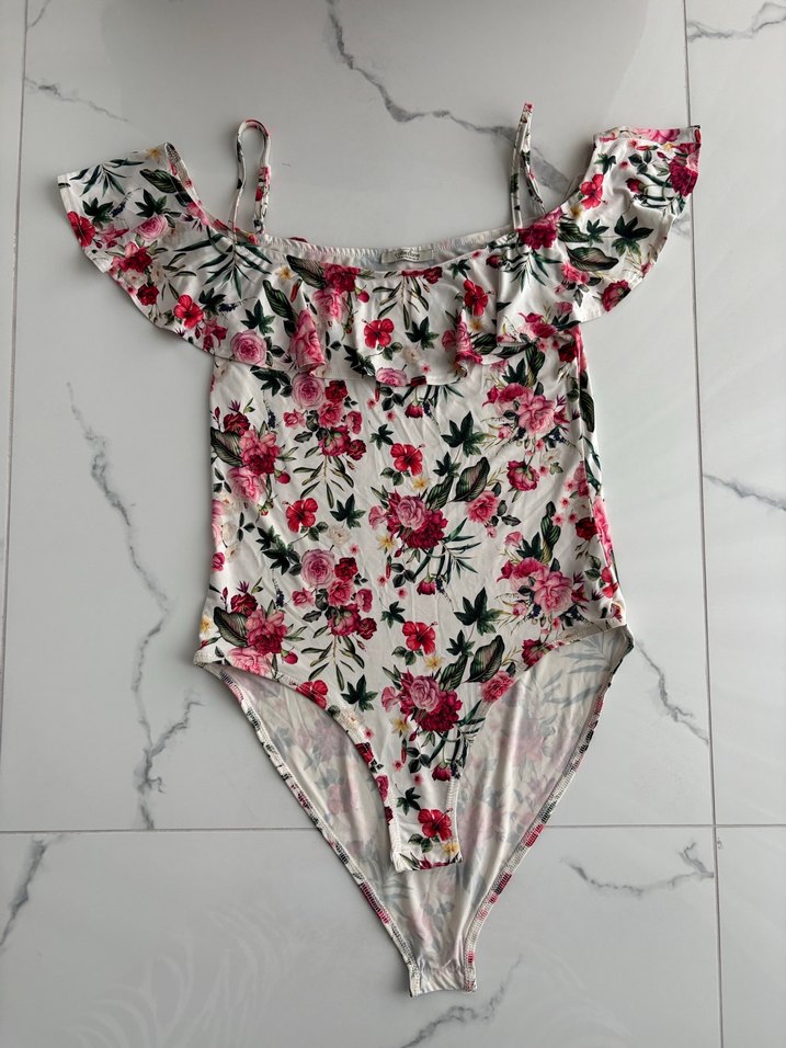 Pembe çiçek desenli, fırfırlı kısa boy, kolsuz ve vücuda oturan bohem tarz mayo bluz. Zıbın. Yepyeni sadece satın aldım çok kaliteli problemsiz