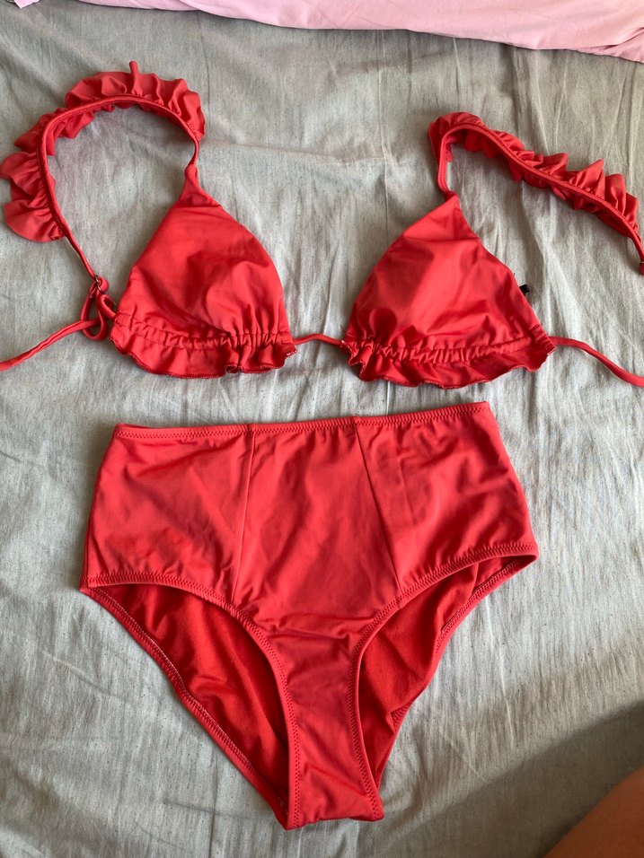 Fırfırlı detaylı askılı mercan bikini takımı, normal boy yüksek bel göbeği gizler. Göğüs pedi mevcut. 1 kere giyildi