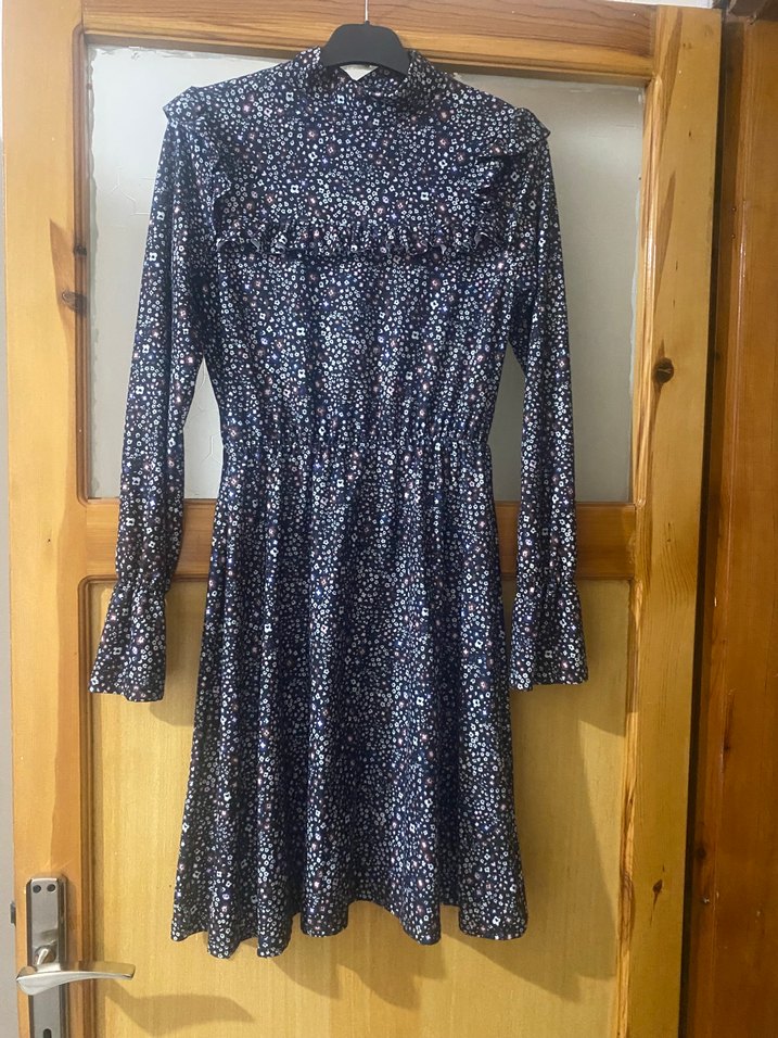 Lacivert midi boy elbise, yüksek yakalı ve uzun kollu, fırfır detaylıdır. Salaş kesimi ve hafif batik deseniyle bohem tarzını yansıtır.