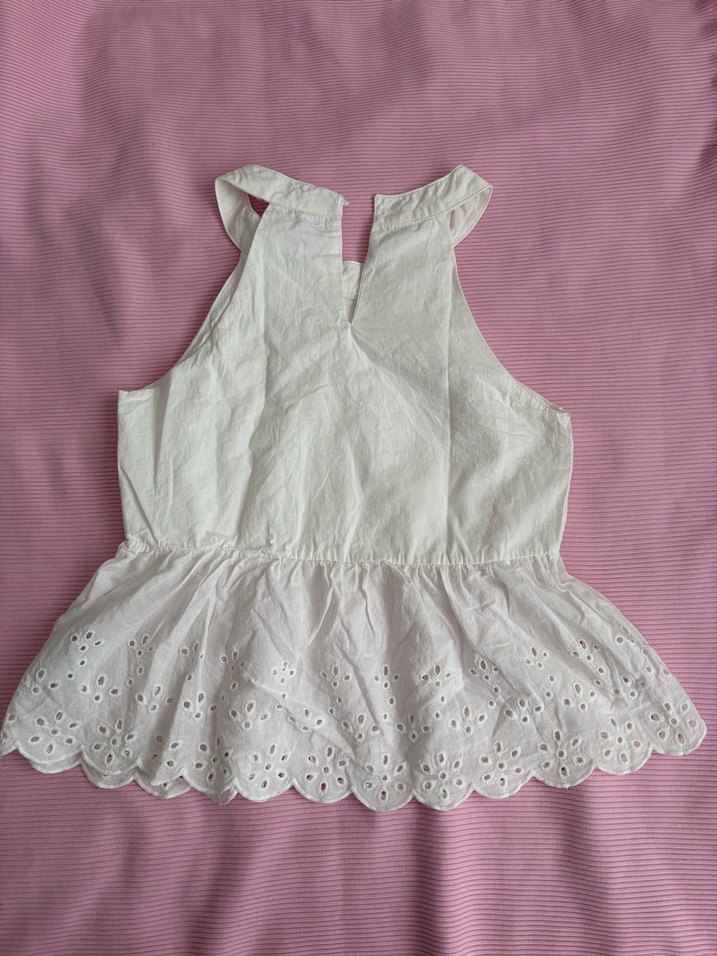 Pamuk kumaştan yapılmış, V yakalı ve kolsuz beyaz bluz. Fırfırlı ve nakışlı detaylarıyla bohem, retro tarzda, vücuda oturan kesime sahiptir.