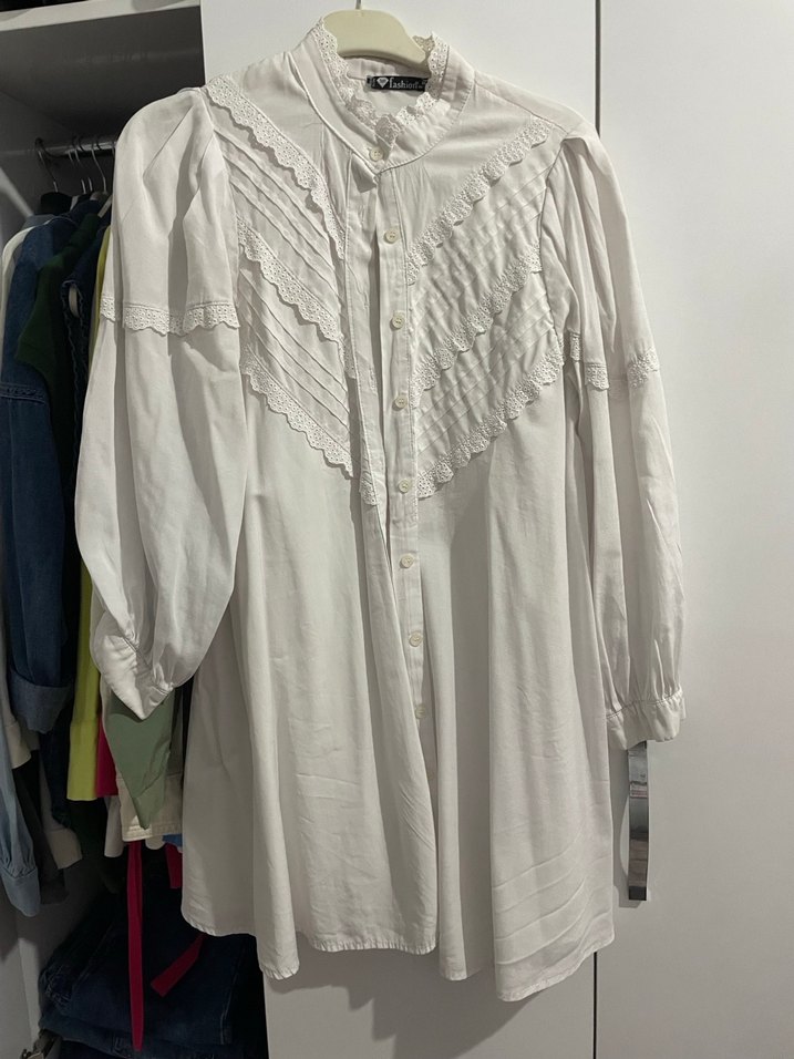 Beyaz keten kumaştan, uzun kollu, yakalı, fırfır ve nakış detaylı bol kesim gömlek