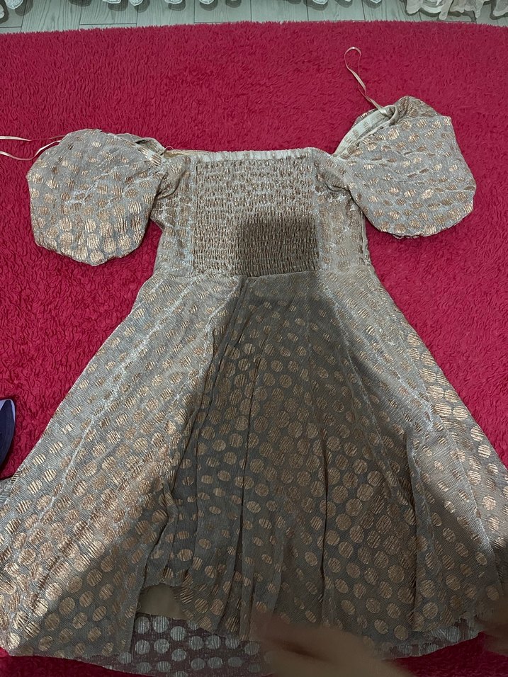 Nakışlı fırfırlı detaylara sahip, straplez yaka ve askılı kollu, bohem tarzda, normal midi uzunlukta, vintage görünümlü gri renkli, vücuda oturan elbise. Bir kere giyildi hiçbir sıkıntısı yoktur.