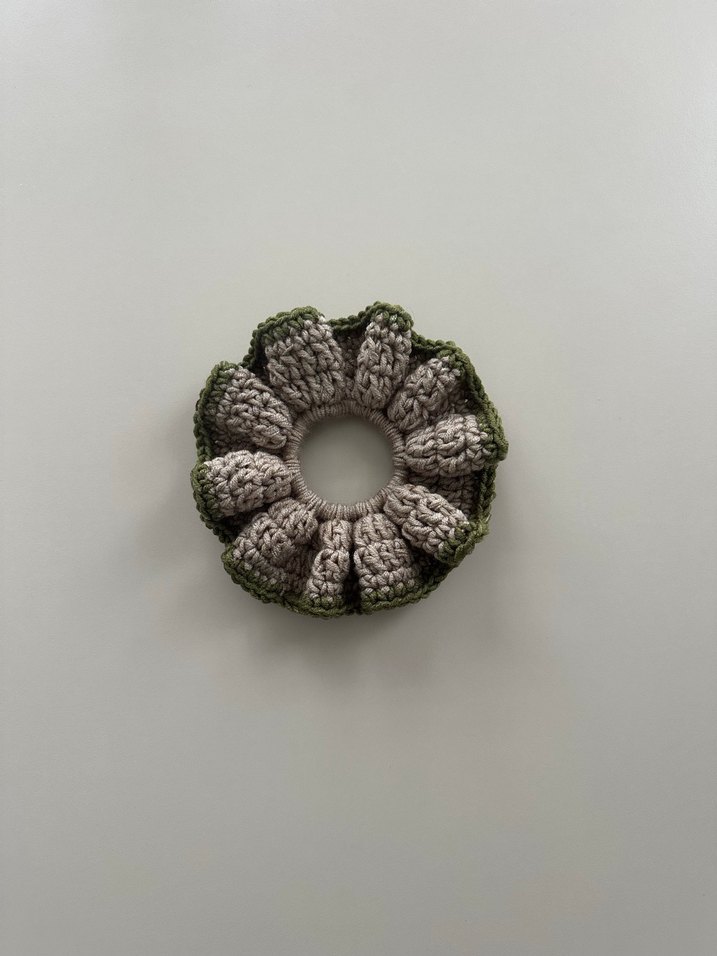 Fırfırlı tasarıma sahip örgü saç tokası, vizon ve yeşil tonlarda olup bohem ve retro tarzlar için rahat bir görünüm sunar.