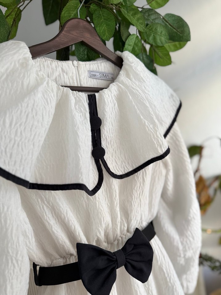 Gelin mevlidi ve cinsiyet partilerinde kullanılabilir Nakışlı desen ve siyah fiyonk kemerle modern klasik tarz sunar. Günlük kullanım kemersiz kullanılabiliyor