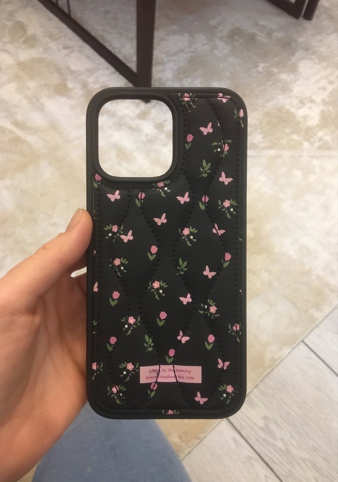 Koyu zeminde pembe çiçek ve kelebek desenli, fırfır detaylı streetwear tarzı telefon kılıfı. 16.promax için uygundur