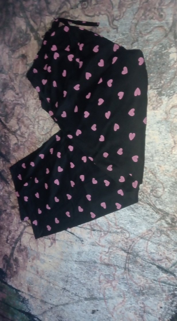 Yumuşak sentetik kumaştan, pembe kalp desenli, fırfırlı uzun ve rahat kesim pantolon.