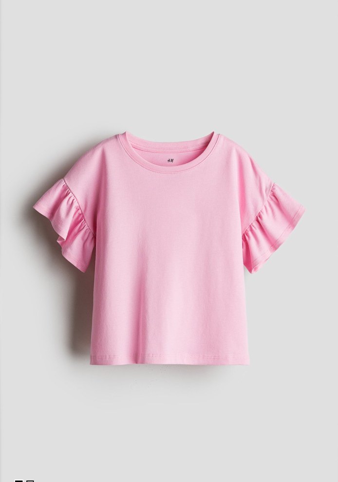 Pastel pembe renkli, kısa fırfırlı kollu kız çocuk tişörtü. Pamuk kumaştan, yuvarlak yakalı ve bol kesim. Hafif batik desenlidir.