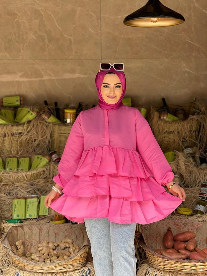 Açık pembe renkte, yüksek yakalı ve uzun kollu, bol kesim mini tunik. Kat kat fırfır detaylı ve hafif batik desenlidir, modest sokak stiline uygun.