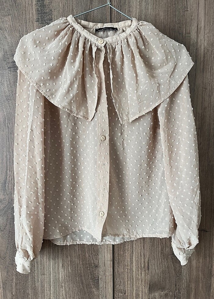 Bej rengi. Hiç kullanılmadı. Fırfırlı, romantik, manşetleri düğmeli.