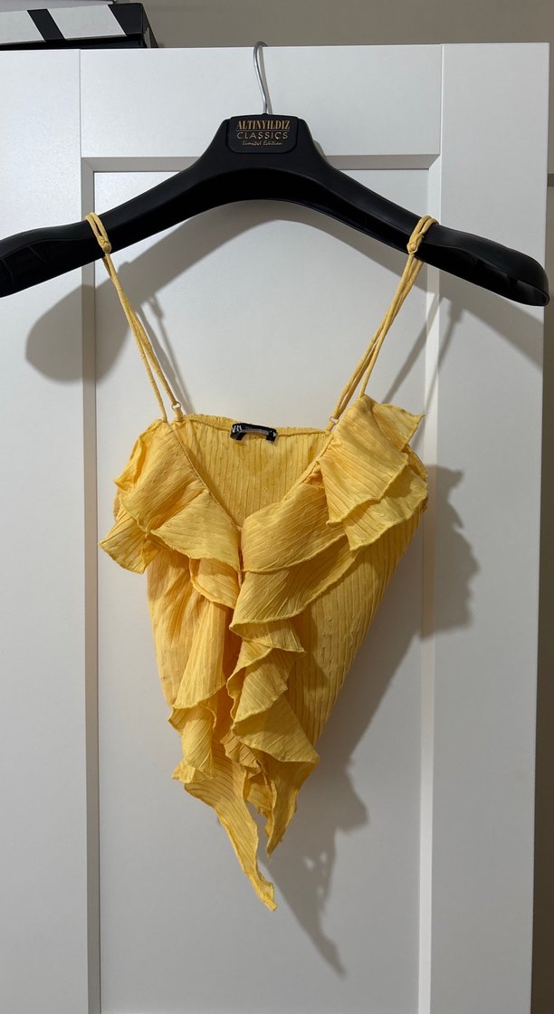 Sarı mini büstiyer, askılı. Fırfır detayları ve bohem bağlama desenli şık tasarımıyla dikkat çeker.