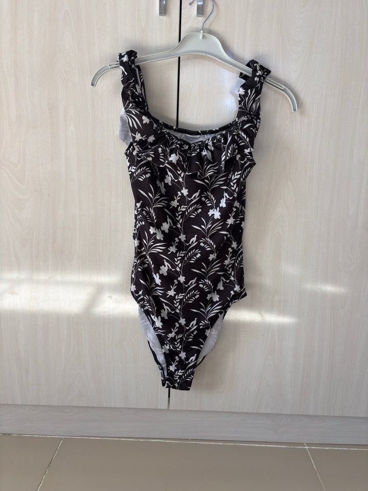 Fırfırlı askıları ve koyu renk çiçek desenli, vücuda oturan siyah midi mayo. Plajda şık bir tercih.