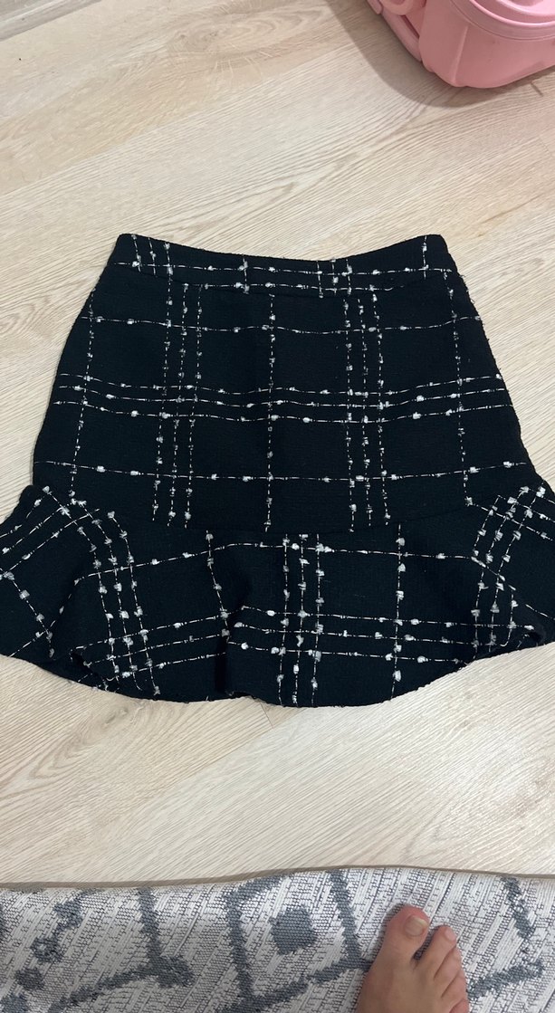 Sentetik kumaştan, ekose desenli ve fırfırlı etek ucu detaylı, siyah, dar kesim mini etek. Romantik buluşmalar ve gündelik şıklık için uygun.