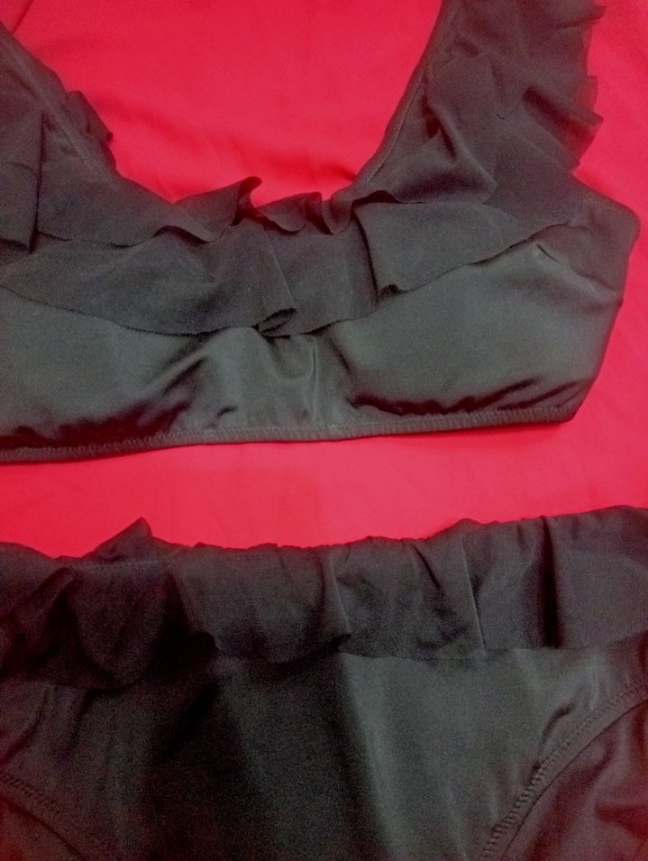 Fırfırlı detaylara sahip siyah, vücuda oturan kadın mayosu. İnce askılı, gotik tarzda ve parti için uygun, normal midi boyda, desensiz.