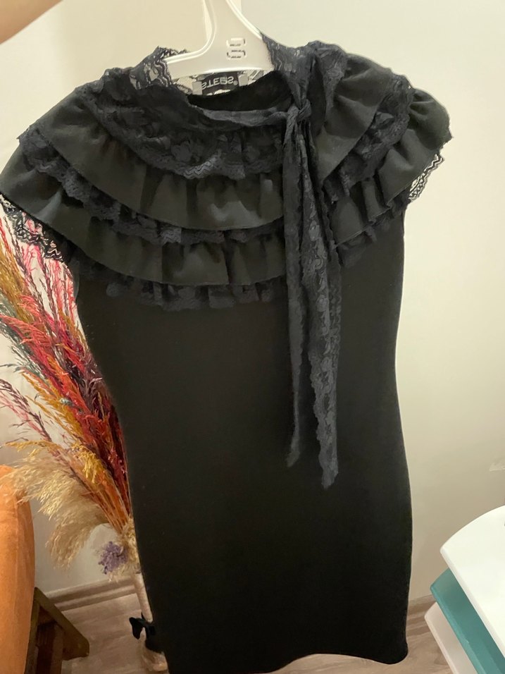 Siyah, fırfırlı ve dantelli detaylı, haki. yakalı ve kolsuz, vücuda oturan uzun gotik abiye elbise ha tabi size kalmış nerede nasıl giyeceğiniz umarım çok güzel günlerde giyersiniz şimdiden mutlu günlere.