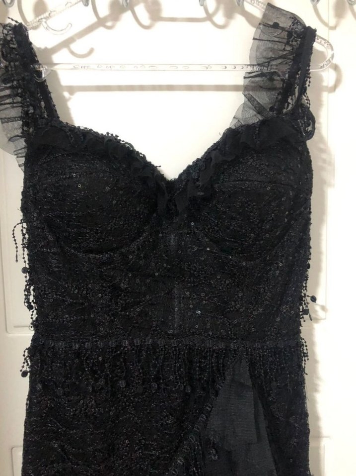 Siyah, v yaka, askılı, nakışlı ve fırfırlı detaylara sahip, dar kesim gotik uzun abiye elbise.