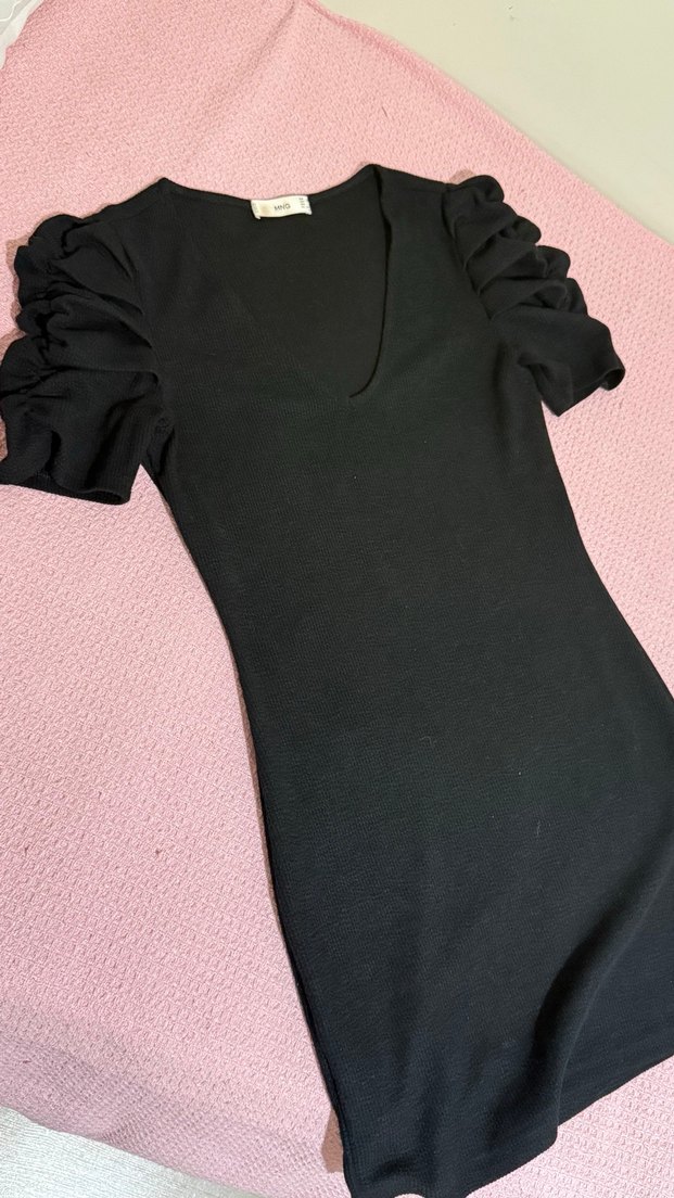 V yakalı, kısa fırfırlı kollu, siyah elbise. Gotik tarzda, şık ve rahat bir görünüm sunar. Romantik akşamlar için ideal.