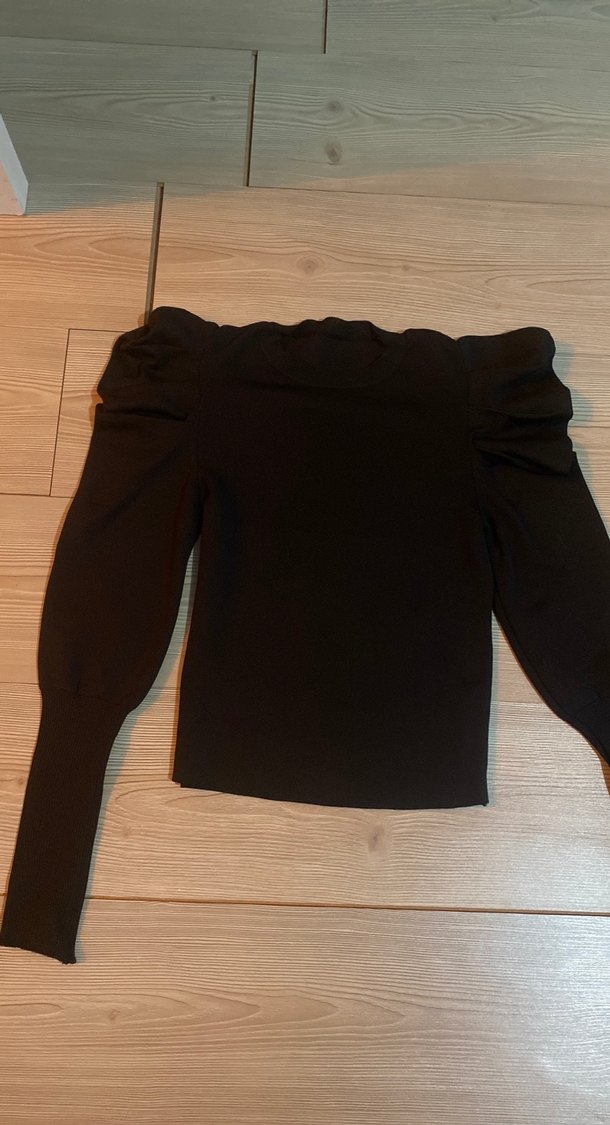 Siyah, uzun kollu ve bisiklet yaka, omuzlarda fırfır detaylı, vücuda oturan triko. Yumuşak sentetik kumaştan, rahat ve gündelik tarzda.