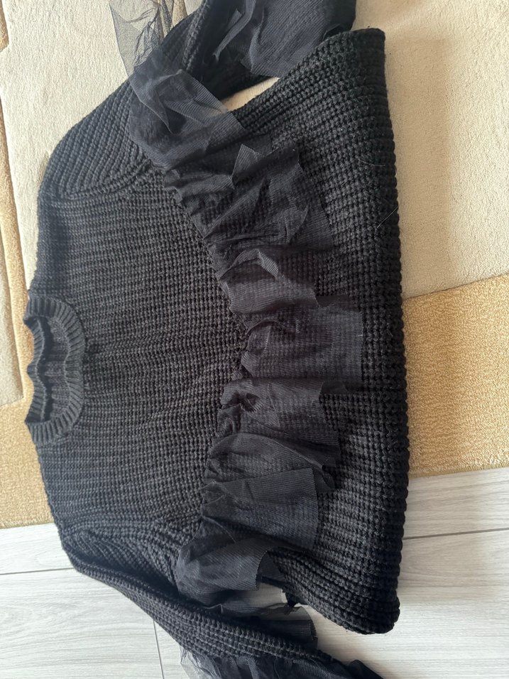 Dar kesim siyah kadın triko kazak, uzun kollu ve yuvarlak yaka. Kollarında fırfır detayı bulunur. Yumuşak sentetik kumaştan, gündelik kullanım için uygundur.