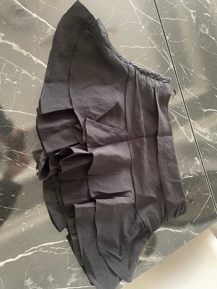 Siyah keten mini etek, bol kesim ve fırfır detaylarına sahip. Dış mekan gotik tarzı için uygundur, desenli değildir ve kısa boydadır.