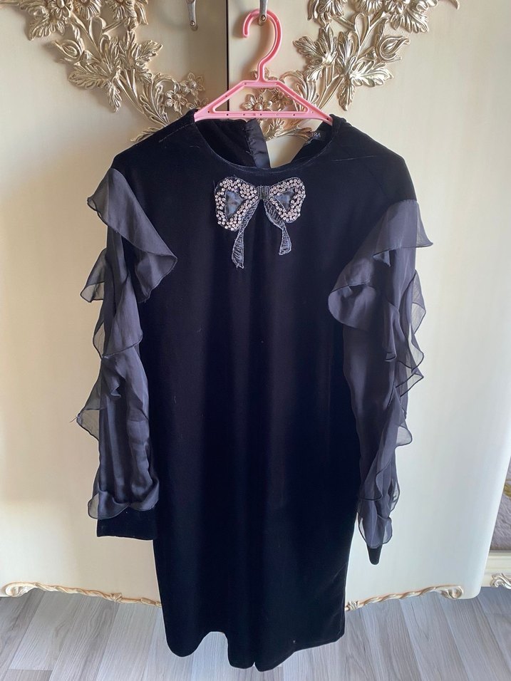 Bu 40 beden l bedene kadar olur Uzun fırfırlı kollar ve nakışlı fiyonk detaylı, siyah midi boy, bol kesim gotik elbise. Parti için uygun şık tasarım.