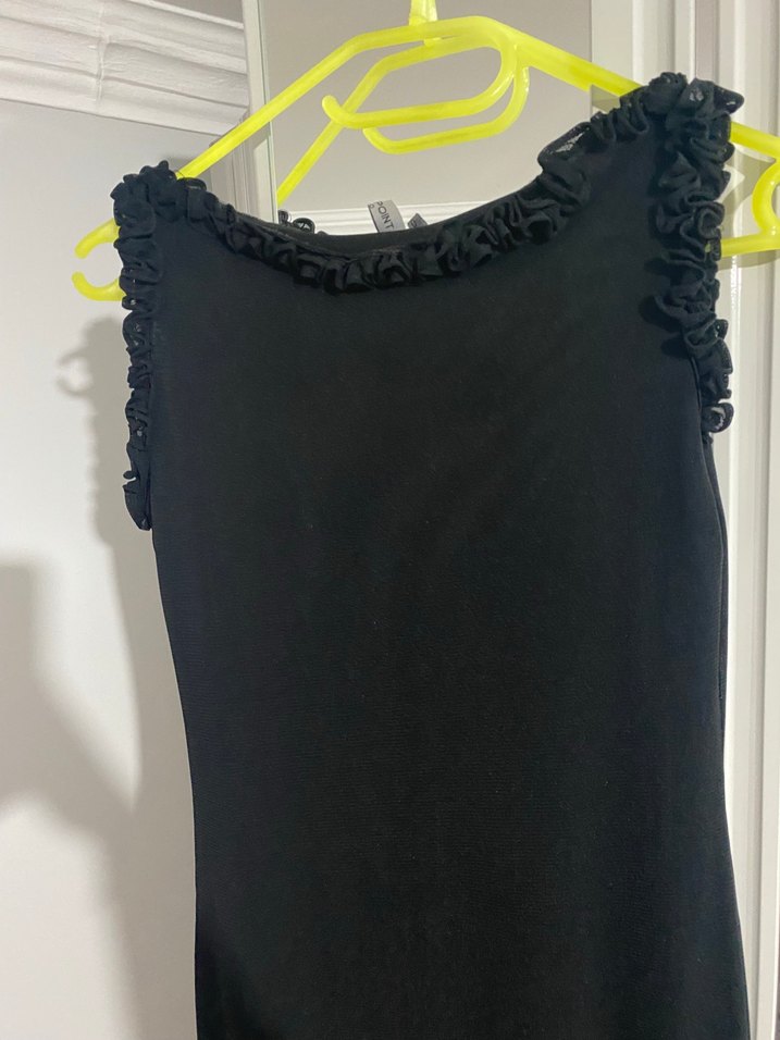 Fırfırlı detaylara sahip, balıkçı yaka ve kolsuz siyah midi elbise. Gösterişli ve got tarzıyla parti için uygun, vücuda oturan kesim.