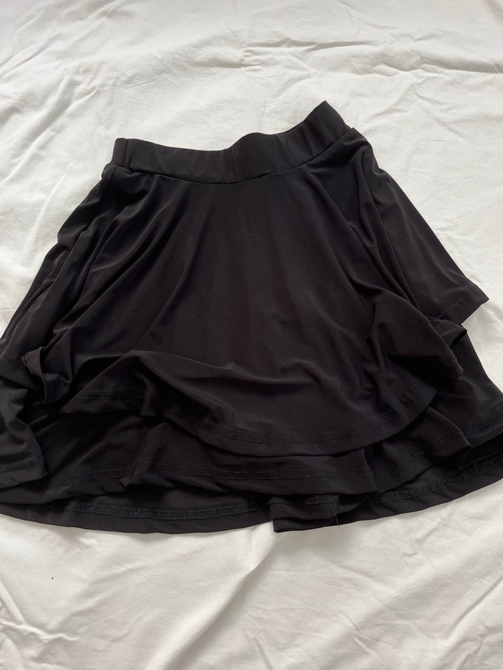 Siyah midi etek, yumuşak sentetik kumaştan ve fırfır detaylarına sahip.