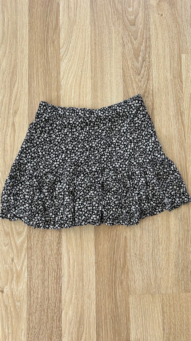 Fırfırlı detaylı, siyah beyaz tie-dye desenli, gevşek kesim mini etek. Yumuşak sentetik kumaştan, rahat dış mekan kullanımı için uygun.