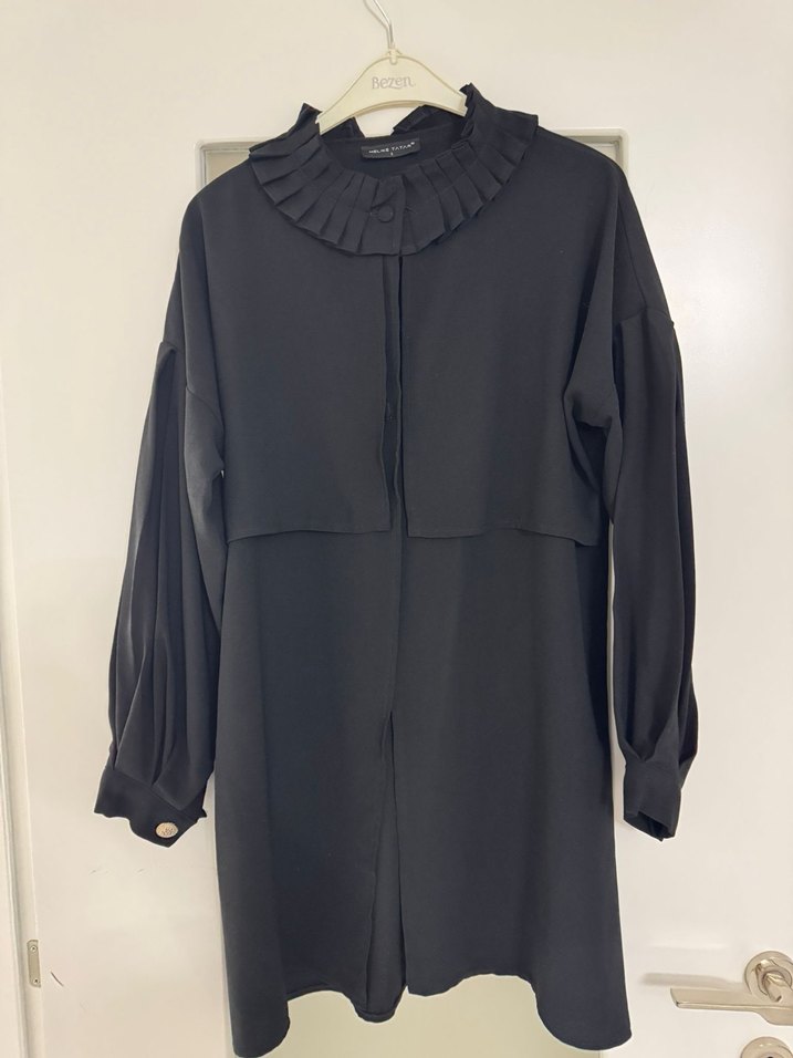 Siyah renkte, fırfırlı yüksek yakalı ve uzun kollu, ipeksi kumaştan yapılmış, bol ve uzun kesimli tunik. Ofis için şık bir tercih.