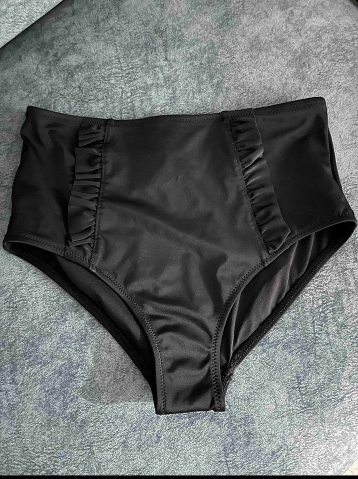 Siyah yüksek bel bikini altı, fırfır detaylı ve vücuda oturan kesimiyle cesur, gotik athleisure tarzında plaj için uygundur. ️