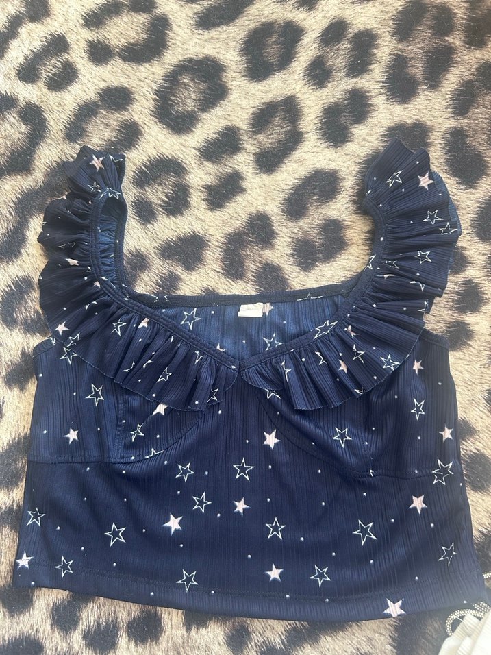 Yumuşak sentetik kumaştan, yıldız desenli lacivert, fırfırlı straplez ve kolsuz, vücuda oturan kadın bluz. Parti için uygundur. ✨hiç giymedim marka temsili