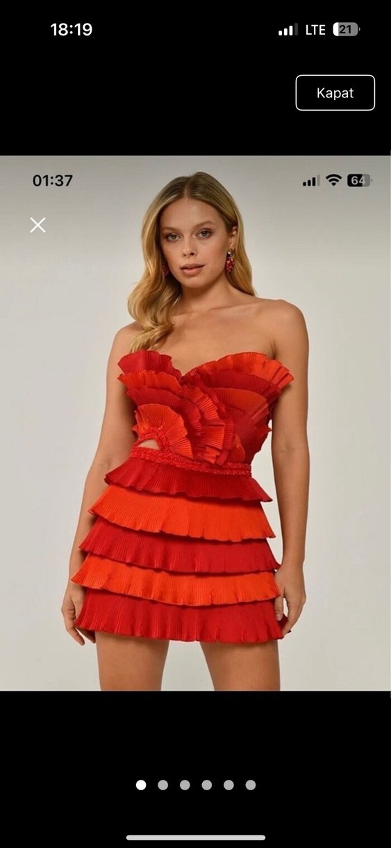 Dar kesim, straplez yakalı kırmızı mini elbise, kat kat fırfırlar içerir. Hafif batik desen ile göz alıcıdır, parti için uygundur. Sentetik kumaştan yapılmıştır.
