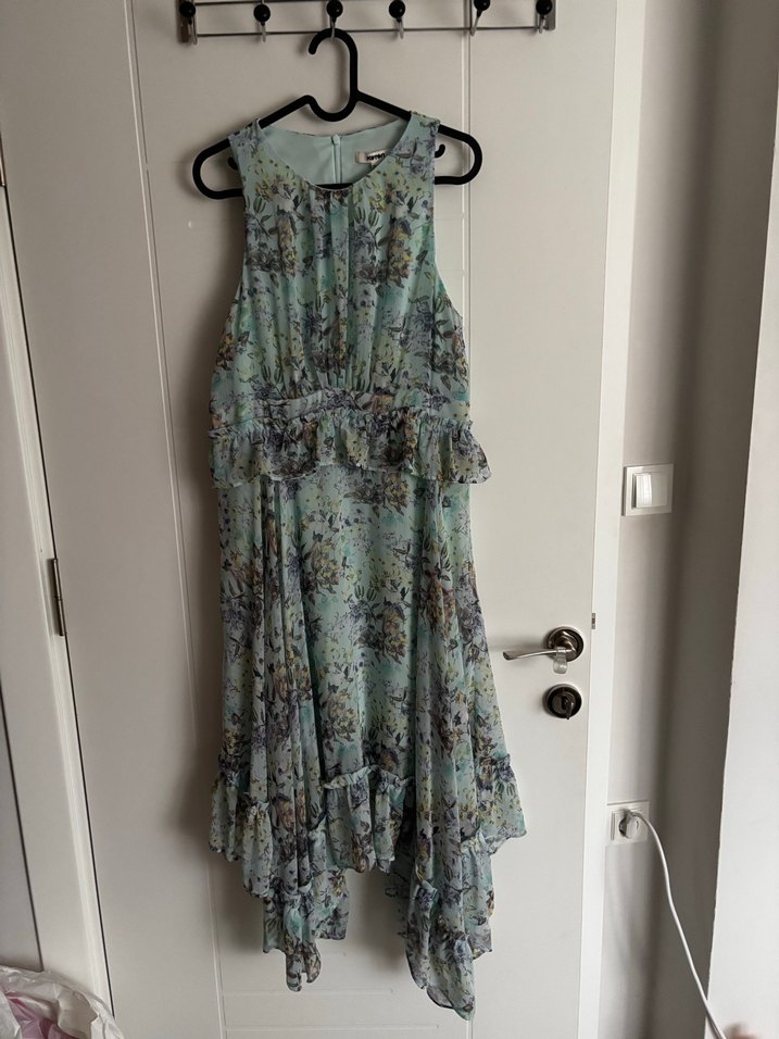 Turkuaz renkte, kolsuz ve yüksek yakalı bu elbise, bol kesim ve fırfır detaylarıyla dikkat çeker. Yumuşak sentetik kumaştan yapılmış, pastel tonlarda batik desenlidir.