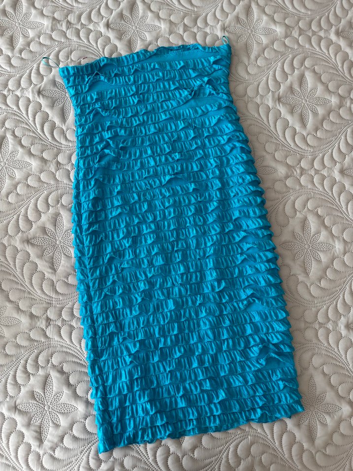 Fırfırlı detaylara sahip, turkuaz renkli, sentetik kumaştan üretilmiş, vücuda oturan elbise.