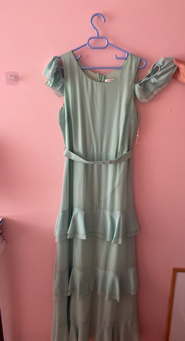 Turkuaz uzun elbise, fırfır detaylı ve kemeri bulunmakta bir kere giyildi