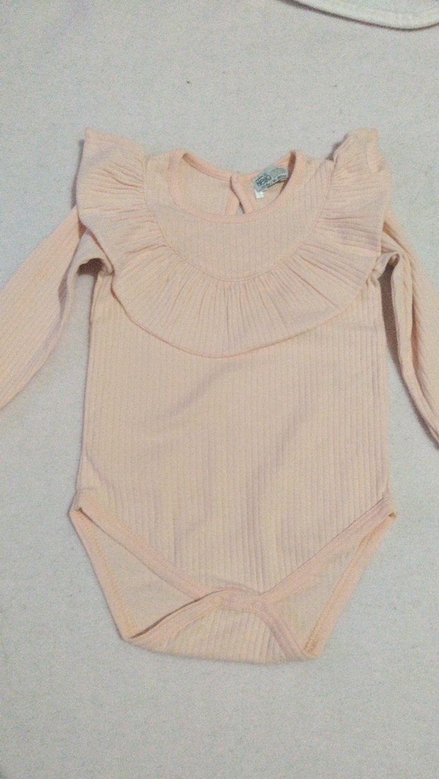 Bej renkli, uzun kollu, yuvarlak yakalı bebek zıbını, yumuşak pastel kumaştan fırfır detayıyla.