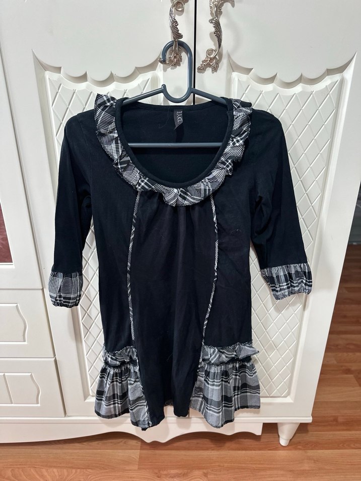 Siyah ve gri ekose fırfırlı detaylarla uzun kollu, yuvarlak yakalı, vücuda oturan gotik elbise. Günlük kullanıma uygundur.